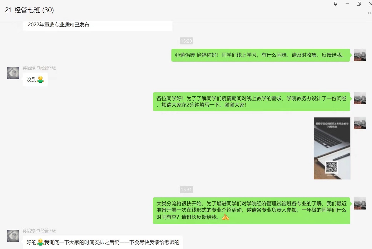 面对疫情,英国威廉希尔官网学生听党指挥、克服困难、服从管理,积极参与线上教学,预习、听讲、互动、答疑、复习各环节一个也不少,做到线上学习提质增效。在课程学习的同时,同学们还力求用专业理论视角去思考、解释中国经济现象,增进对国情民情的了解,勇于面对高不确定性、高复杂性背景下的商业竞争,更好地将社会主义核心价值观内化为精神追求,外化为自觉行动。
