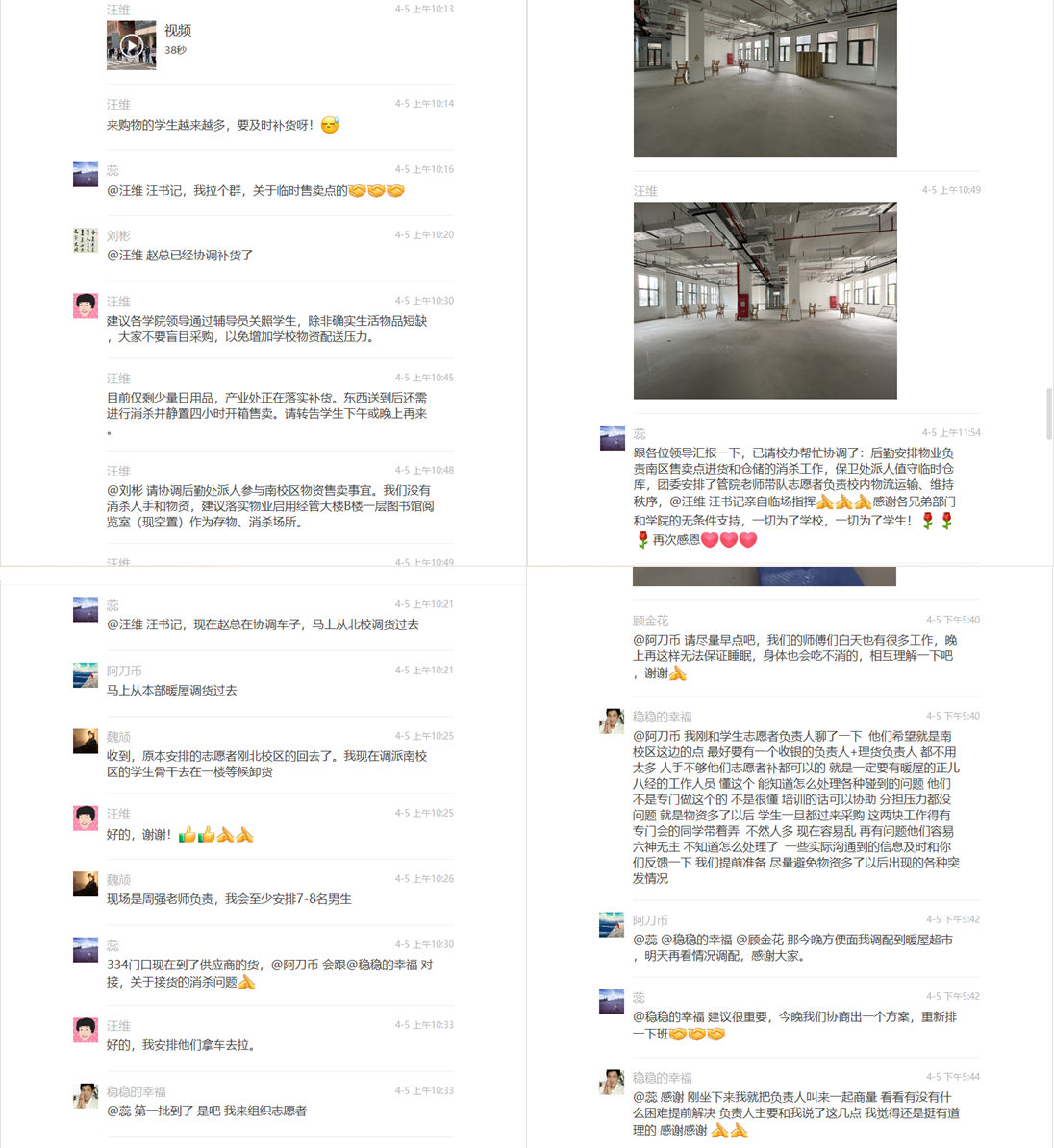 走进“店里”,我们看到同学们在志愿者的引导下,秩序井然地排队购物。有序的背后离不开南北校区各个部门“跨时空”的实时沟通,英国威廉希尔官网现场售卖志愿者反馈货物销售情况,产业处协调补货,保卫处负责货物进校及值守临时仓库相关事宜,学院师生志愿者负责将门口货物运抵临时仓库,后勤安排物业负责南区售卖点进货和仓储的消杀工作,各部门各司其职,实时沟通,根据现场情况迅速调整方案,各项工作环环相扣,忙而不乱,零差错完成。尽管购物人数越来越多,但是效率也越来越高。