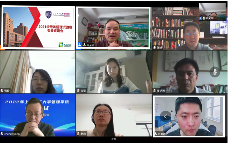 秦炳涛介绍了国际经济与贸易系雄厚的师资力量、良好的专业发展前景以及以赛代学、国际化交流的办学特色。张玲展示了金融学专业的培养目标、专业优势及专业前沿理论教学等,指出本专业具有成熟的产学合作机制,注重学生实践能力培养。吉黎介绍了税收学专业的培养理念、教学建设成效和学生发展路径等,毕业生质量获得财税管理部门、制造业企业和现代服务业等用人单位的充分肯定。陈志勇从办学历史、培养方案以及培养质量等方面,全面阐述了会计学人才培养的实践和成果,并提出有助于提升学生学习效果的攻略。赵欣以公共事业管理专业的办学特色和优势为重点,介绍了本专业师资队伍建设、课程建设、学生创新能力培养等方面取得的成果。刘勤明基于国家对工业工程的战略需求,阐述了专业的办学思想和教育教学成果,指出本专业与中国商飞、西门子、申通地铁等大型企业建立了联合培养机制,为学生提供了良好的实训实践平台,学生培养质量不断提高。随后,同学们根据个人专业兴趣及疑惑向老师们提问,进行交流探讨。