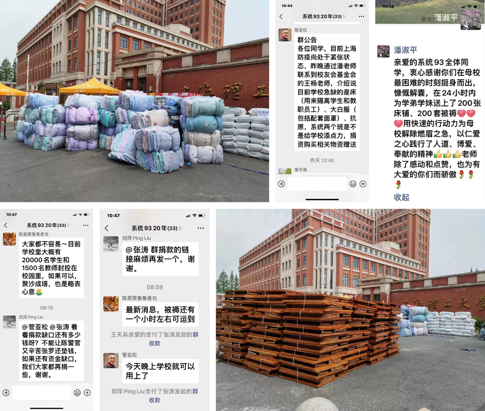 得知学校防疫物资紧缺并与班主任潘淑平老师沟通目前最紧急的需求后,93级系统工程专业校友们在班长管亚松的组织下积极捐款捐物,校友陈美雯协助寻找货源、组织运输。广大校友和校友(李卓)企业上海佳明机械有限公司共为学校捐赠200张床和200套被褥三件套。关键时刻他们挺身而出,快速行动,24小时送达,以实际行动表达对学校的关心和支持,解学校的燃眉之急。
