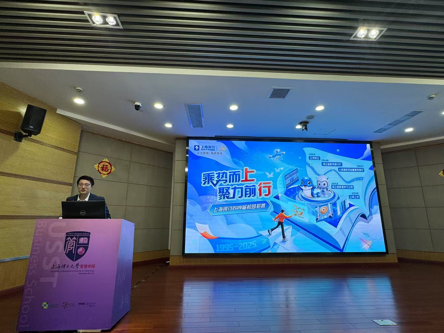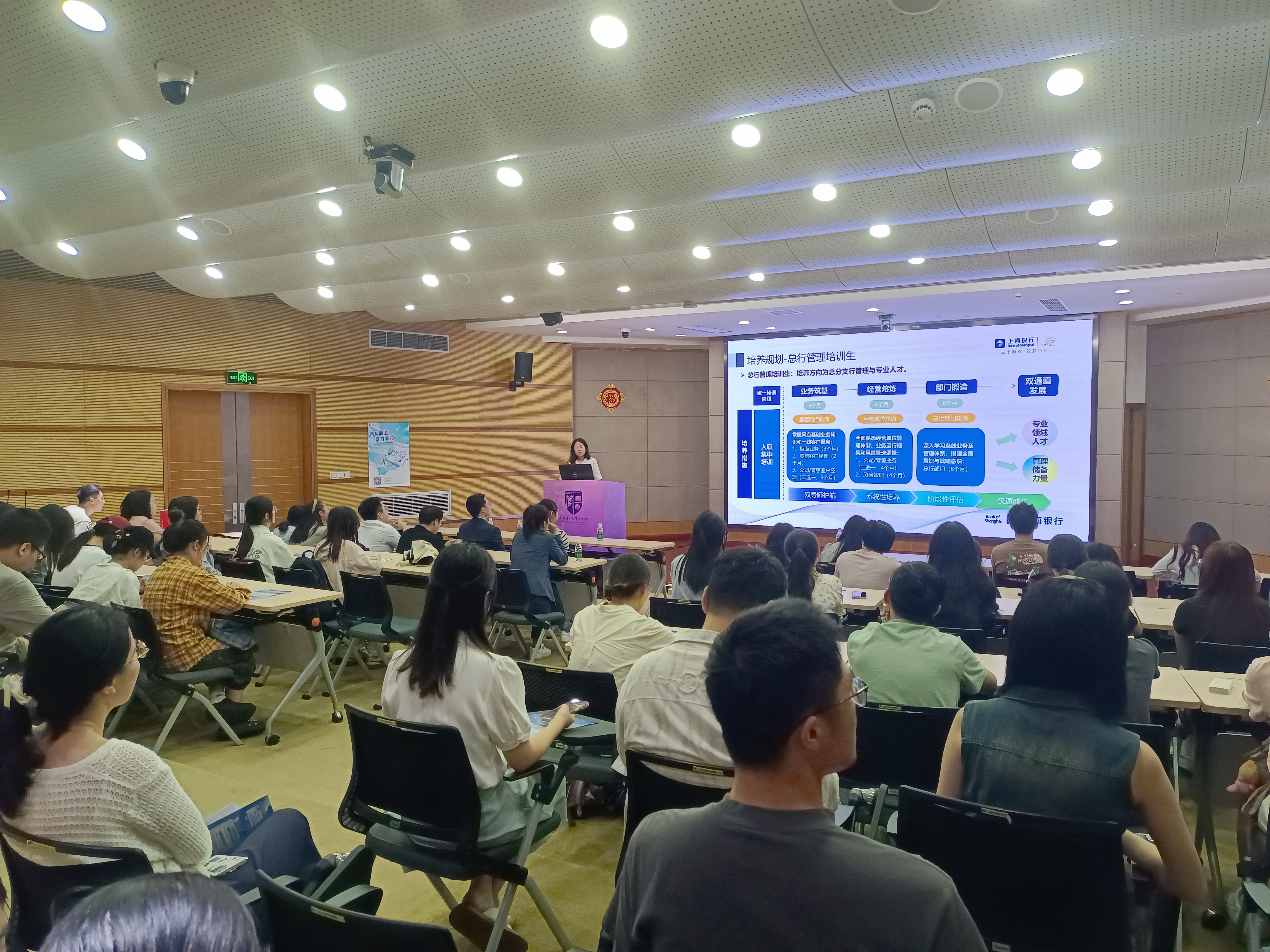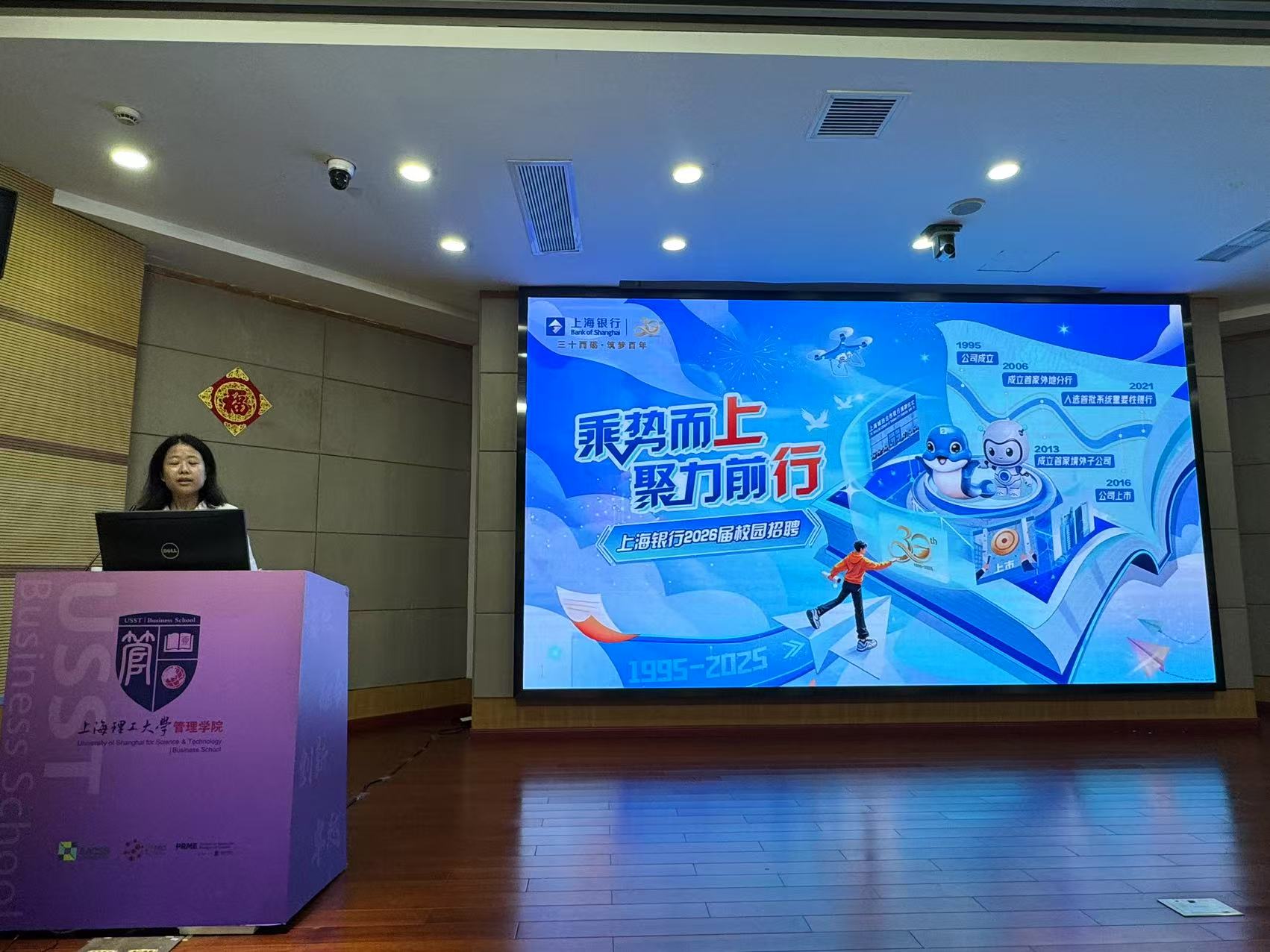 宣讲会现场氛围热烈,上海银行浦西分行人力资源部主管张之琳女士担任主讲。她以“乘势而上,聚力前行”为主题,带领大家回顾上海银行发展脉络,生动展现出银行发展近况,让同学们直观感受到在金融行业发展的广阔空间。紧接着,张之琳重点详解2026届毕业生招聘计划,总行管理培训生、职能类岗位、金融科技岗位等各类岗位的工作内容、职业发展路径与人才培养机制一一呈现。