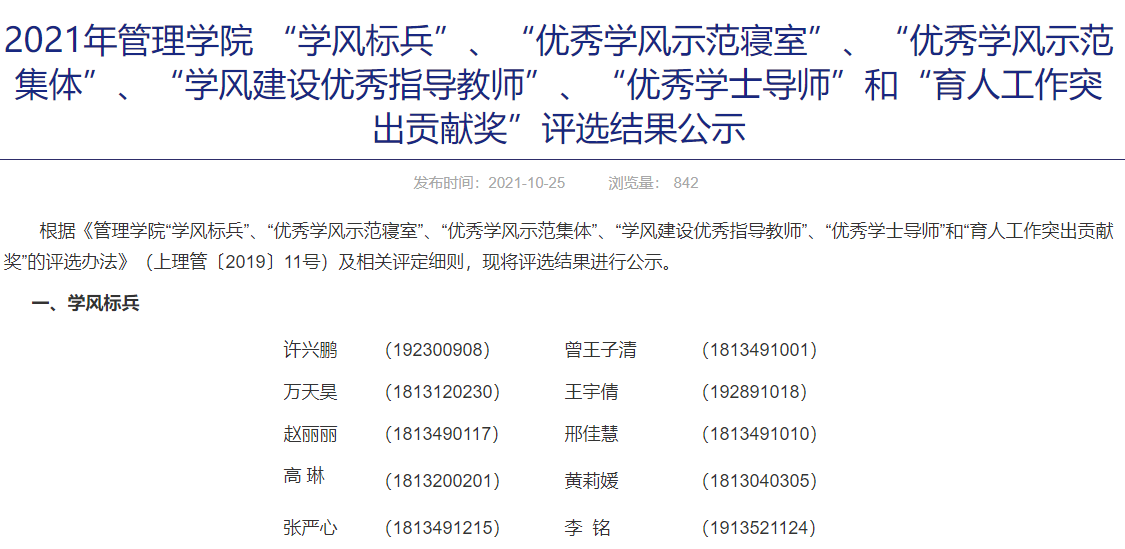 10月25日,学院开展2021年英国威廉希尔官网 “学风标兵”、“优秀学风示范寝室”、“优秀学风示范集体”、“学风建设优秀指导教师”、“优秀学士导师”和“育人工作突出贡献奖”的评选。