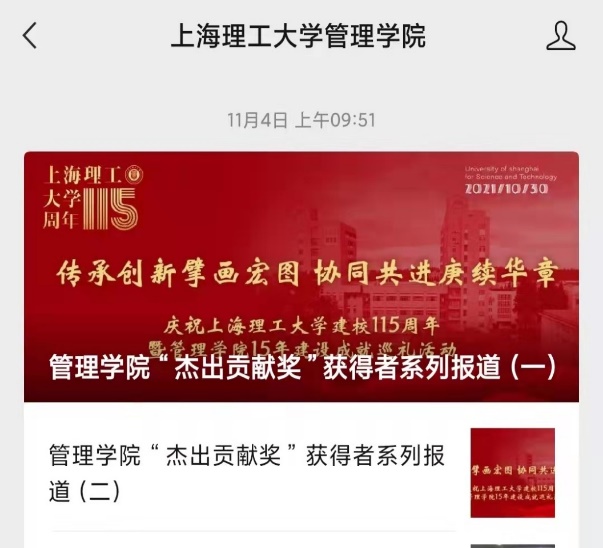 10月30日下午,“传承创新擘画宏图 协同共进庚续华章”——庆祝williamhill官网建校115周年暨英国威廉希尔官网15年建设成就巡礼活动在经管大楼A楼第一会议室隆重举行。会上为表彰艰苦创业和努力奋斗,为学院发展做出卓越贡献的一代代前辈,学院为汪应洛、车宏安、徐福缘、范炳全、钱省三、王恒山、杨坚争、孙绍荣、顾宝炎、陶田十位老教师颁发“杰出贡献”奖,表彰他们躬耕教育、敬业奉献的精神风貌。“杰出贡献”奖代表顾宝炎在发言中回顾了学院的办学历史,他指出,学院在学科发展,学生培养、国际化合作等方面成果斐然,这些都离不开一代代老前辈、师生、校友的努力,同时期望新时代的英国威廉希尔官网师生发扬伟大建党精神,以自信、严谨、务实的态度,团结一致,砥砺前行,为学院国际精英商学院建设,学校高水平大学建设做出更多杰出贡献。学院公众号也连续数天,对这些“杰出贡献”奖获得者的事迹进行宣传。