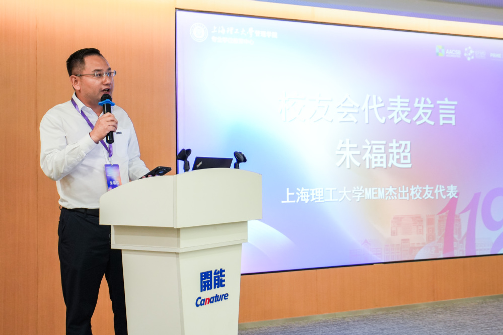 三位来自不同领域的校友代表结合各自行业实践,从多个层面诠释了“全链条创新”的内涵。MBA校友会秘书长、上海隆源实业有限公司总经理朱守瑞从企业管理角度出发,强调智能化转型须“软硬兼施”,以管理创新激活技术效能。MPA校友会会长、上海金虹帆文化传媒有限公司总经理刘新立将视角延伸至更广泛的社会生态,提出应构建政府、企业、社会共创的“雨林式”生态,管理者应成为连接各方的催化剂。MEM杰出校友代表、人民浩满电子科技有限公司总经理朱福超则基于系统思维,探讨了如何将前沿技术转化为稳定可靠的产业解决方案。