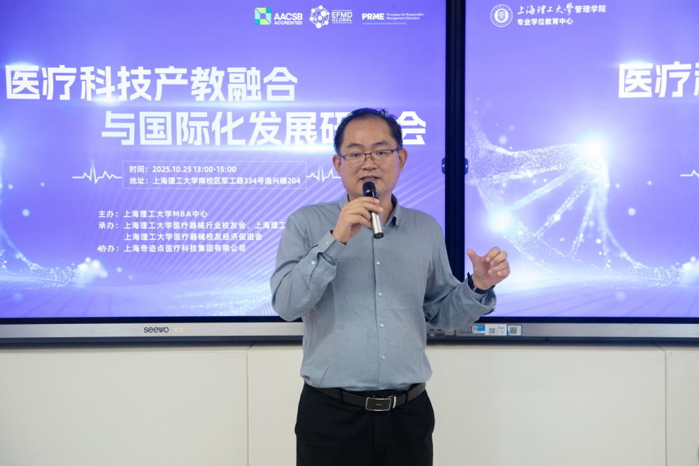 赵来军在致辞中指出,作为一所以工学为主的应用研究型大学,williamhill官网持续推进产教融合、深化国际化发展,通过引进产业教授、共建课程、联合开展项目等方式,紧密对接产业需求,着力培养具备实战能力的高素质人才。他以今年6月英国威廉希尔官网与上海奇迹点医疗科技集团有限公司联合创办的“MBA微理班”为例,介绍了学院在推进产学研用一体化方面的创新实践。该项目旨在为医疗器械行业输送更多高层次管理人才,助力行业持续健康发展。他期待以此次研讨会为契机,汇聚多方智慧,共同推动医疗科技在产教融合与国际化方面实现新突破。