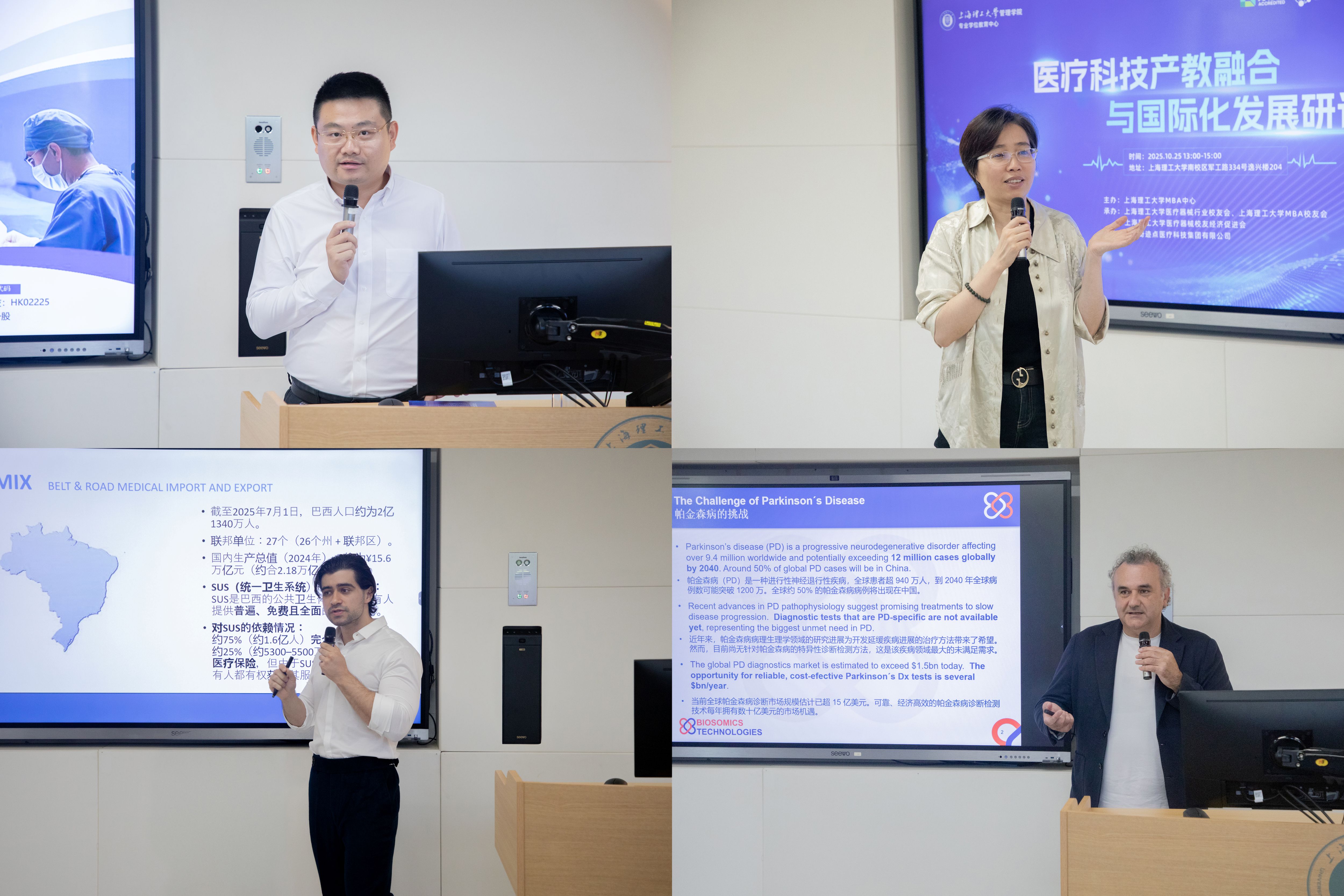 上海今海医疗科技有限公司创始人兼总经理刘镭分享了企业在医工创新与海外市场拓展方面的实战经验,阐述了技术转化与国际化布局的有效路径。临港新片区医疗器械创新中心执行主任田瑞雪围绕“一带一路”背景下中国医疗器械出海的机遇与挑战,结合典型案例,解读了国际化合规与本地化运营的关键策略;该中心巴西合作负责人陆安聚焦巴西市场,探讨了中资企业在拉美地区的合作模式与本土化创新潜力。欧洲脑研究所研究员Marco Feligioni教授介绍了神经退行性疾病早期筛查的前沿研究,分享了如何借助神经生化标志物与人工智能技术,通过便携式LED设备实现帕金森病的早期诊断。