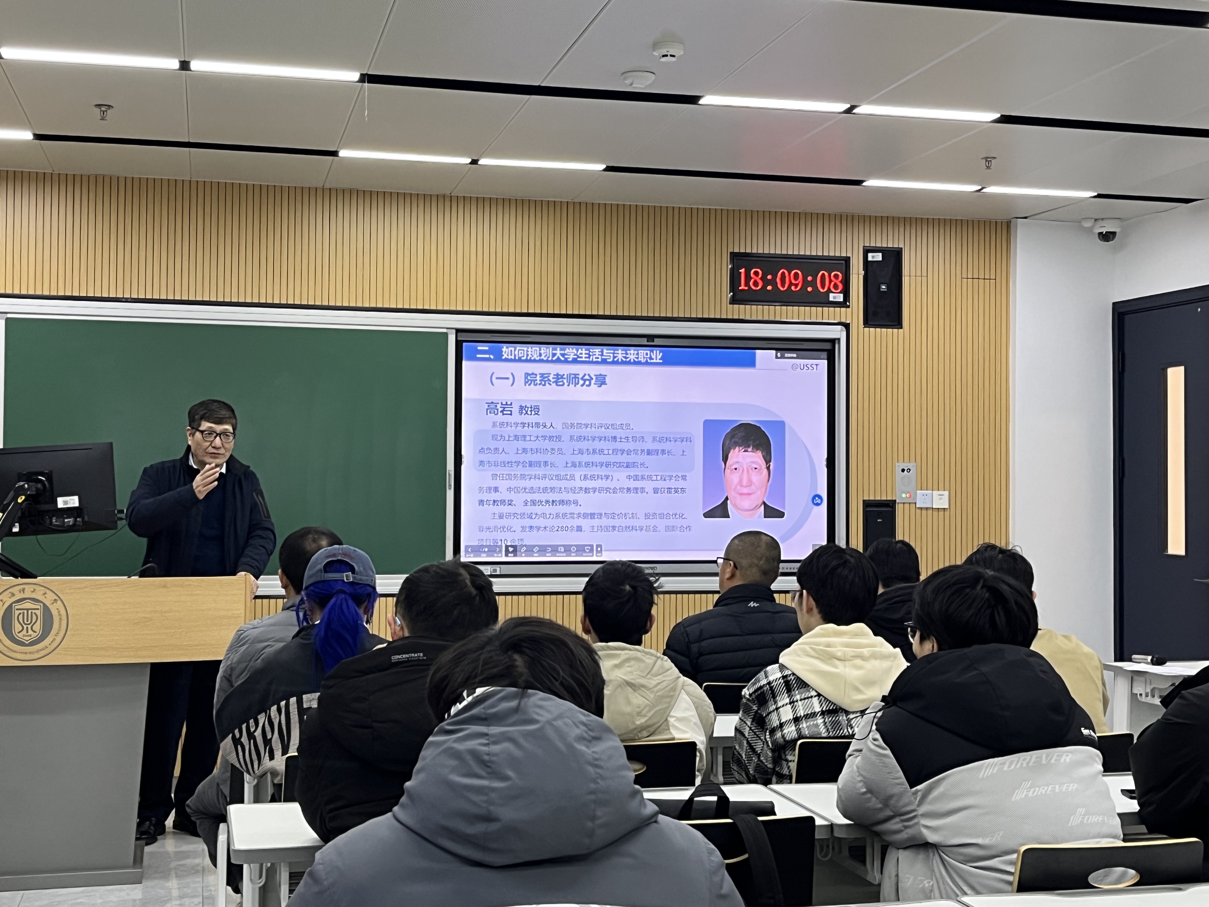 On March 7, the theme class meeting on “Exploration, Planning, and Growth” for the Systems Science and Engineering major was held in Classroom 107, Building Four. Attendees included Gao Yan, the academic leader of Systems Science; Liu Yuanhua, Party Branch Secretary; Gu Changgui, Director of the Department of Systems Science; Zhang Guang, Deputy Director of the Department; Meng Fei, a young faculty member; Zheng Yu, Class Advisor for the 2022 undergraduates; four outstanding alumni; and all first-year students of the 2023 class. The event facilitated in-depth discussions on career development, further education, and employment planning, and was presided over by Chen Qian, the class advisor for the 2023 systems science major students.